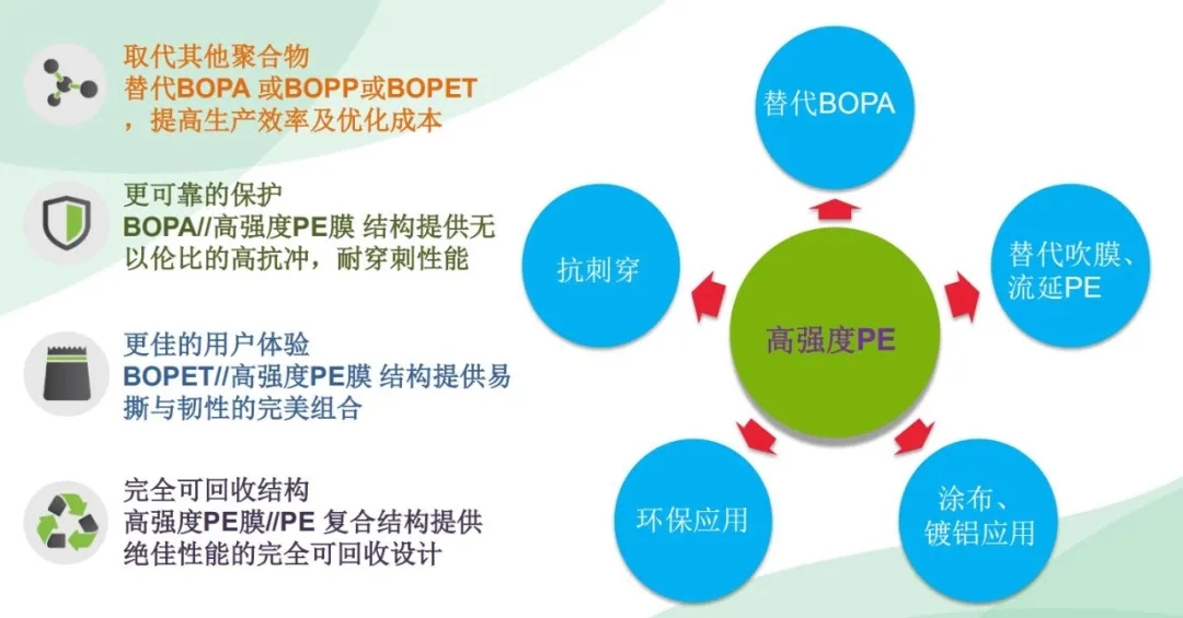 高強度PE膜,相比較傳統(tǒng)的PE吹膜或CPE膜,在提升機械強度的同時,能實現(xiàn)材料輕量化,兼具優(yōu)異的光學性能、材料柔韌性,耐撕裂穿刺、耐揉折及熱封合牢固等優(yōu)點。